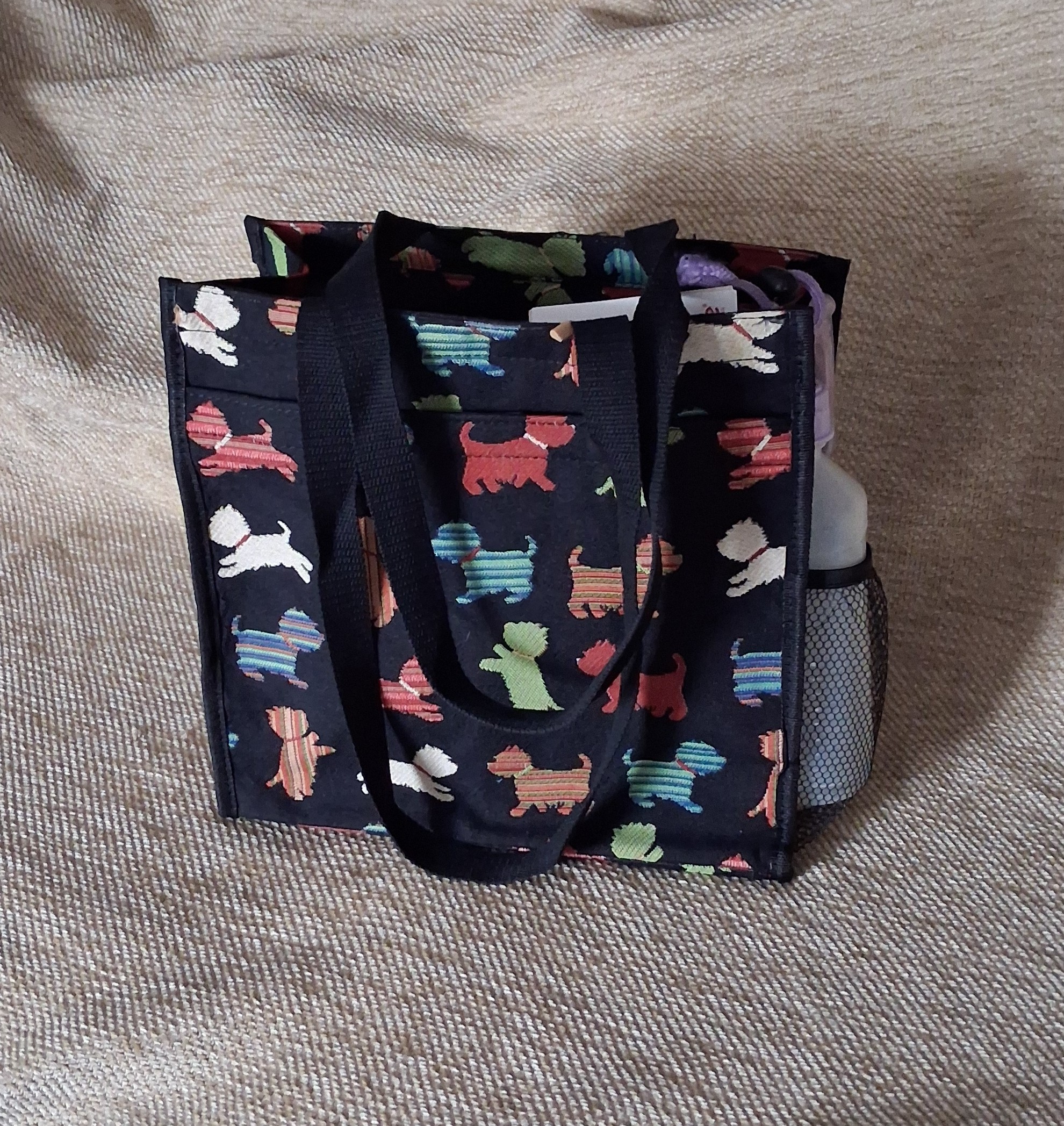 A shopper bag, zip fastening with 2 side pockets and a water bottle holder at the side of the bag. Height 300cm and width 135cm