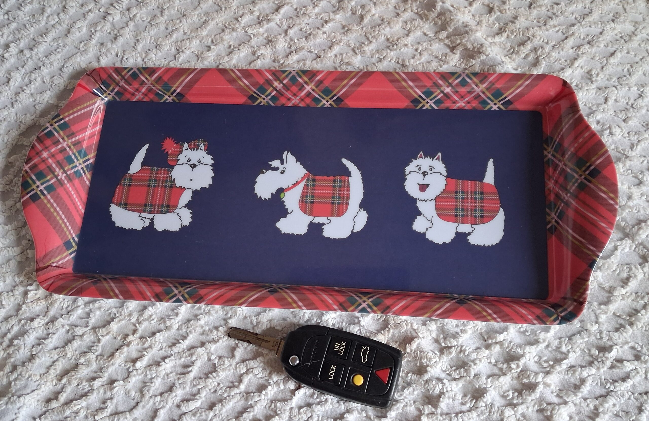 Colourfully decorated tray depicting three Westies.